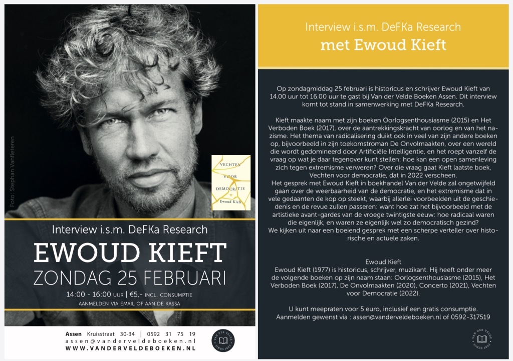 Op zondagmiddag 25 februari is historicus en schrijver Ewoud Kieft van 14.00 uur tot 16.00 uur te gast bij Van der Velde Boeken Assen. Dit interview komt tot stand in samenwerking met DeFKa Research.